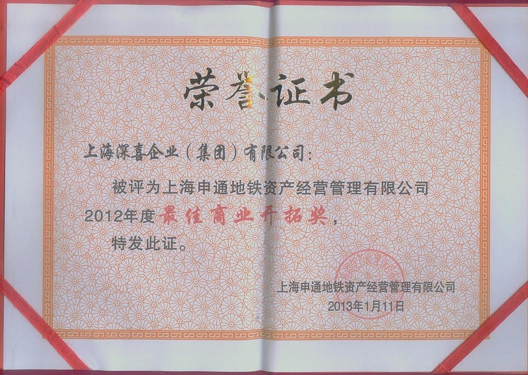 上海深喜企业(集团)有限公司荣获2012年度“最佳商业开拓奖”