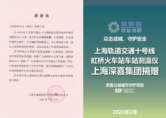 在全国上下抗击新冠肺炎疫情期间,上海深喜集团积极响应《上海地铁运营防疫防护物资捐赠倡议》,守望相助,慷慨解囊,于2020年2月向上海申通地铁资产经营管理有限公司捐赠了一批测温仪,用于地铁车站的检疫工作。